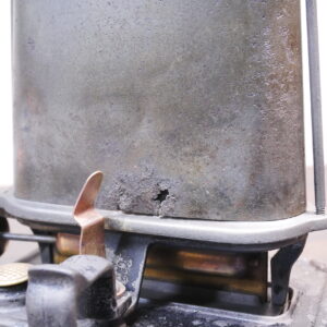 タンクの漏れもありませんし、数時間の使用でも暴走もなく安定して燃焼していました。チムニーの後ろ側は錆による腐食があります。バーナー分のメッシュの金属パーツは作っています。その他チムニーの背面側に錆による腐食が見られます。1部鋳物に割れがありますが使用に問題はありません。(写真枚目)