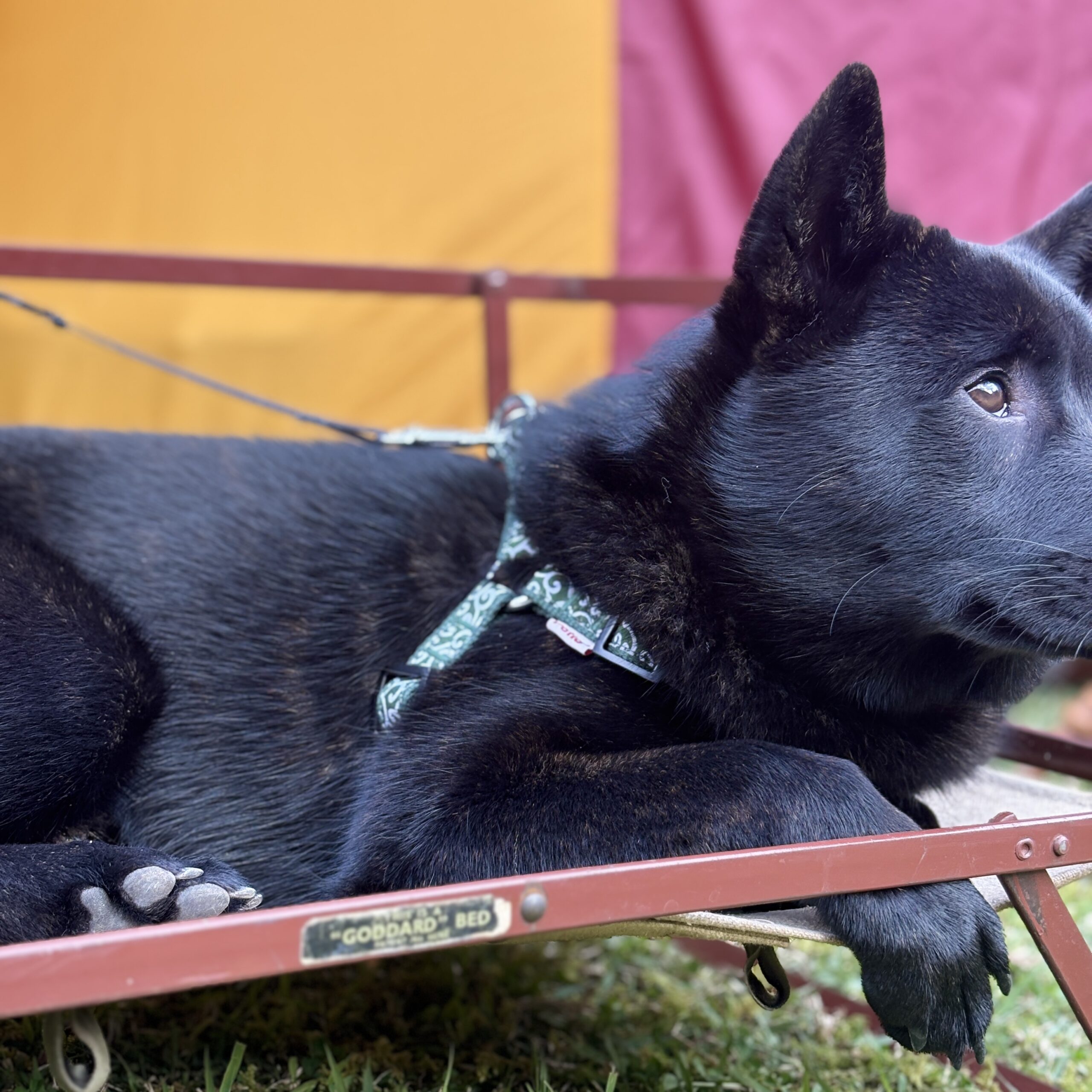 サイズは2種類存在するようで、こちらが大きい方のようです。モデルは甲斐犬の6ヶ月の子犬。約11Kgですが、当時の綿の生地で安定しています。小型〜中型犬(小さめの)子向けになります。